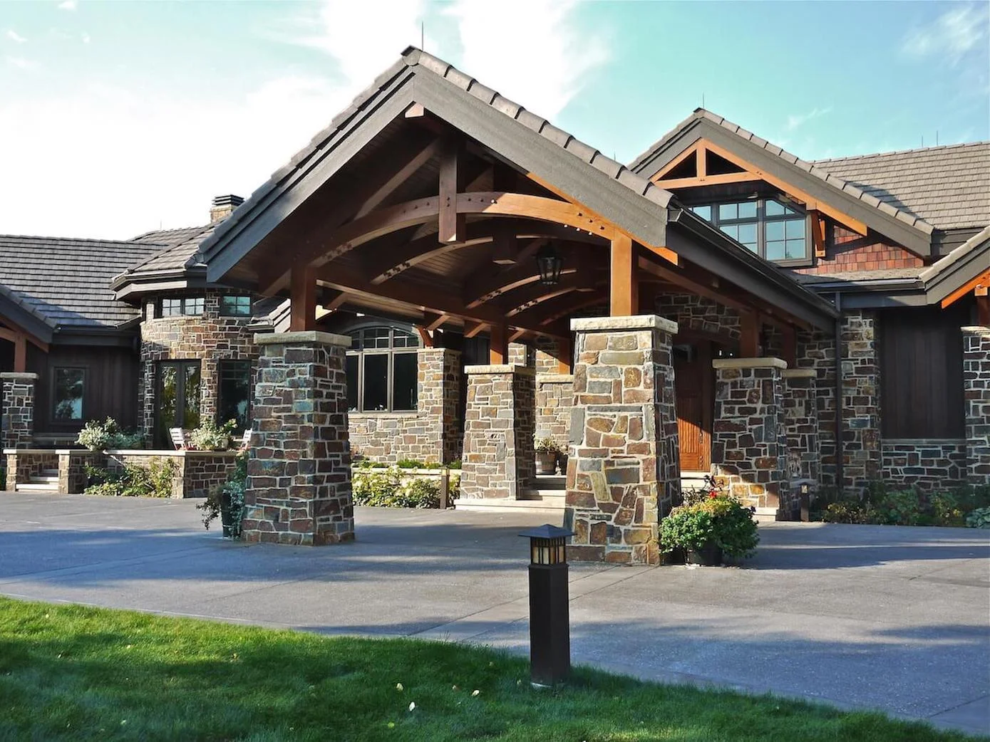 Our challenge on this project was to create an estate home suited for entertaining on a grand scale while providing spaces of an intimate scale for family enjoyment. The exterior features an extensive use of natural materials - timber and stone - as well as varied roof lines and massing to provide visual interest in individual elements along extended facades. The interiors repeat the varied use of natural finishes in a series of open rooms complemented by pockets of space comfortable for 2 to 4 individuals.